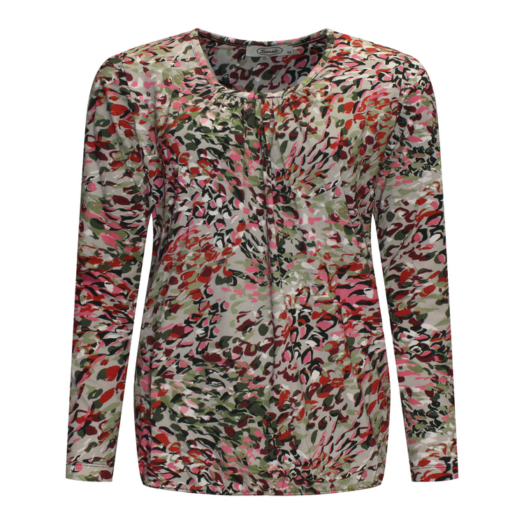 Blouson Lotte is een kleurrijk kledingstuk met een opvallend patroon in groen, roze en rood. De ronde hals en lange mouwen zorgen voor comfort en draagbaarheid. Een echte eyecatcher voor het najaar, makkelijk te combineren met rustige basics.