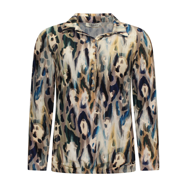 Sensia Blouson Milou met kraagje en knoopsluiting, lange mouwen en een comfortabele elastische band onderin. De meerkleurige print in zachte beige tinten zorgt voor een warme en stijlvolle uitstraling. Gemaakt van een soepele stof, perfect voor het najaar en eenvoudig te combineren met een pantalon of jeans.