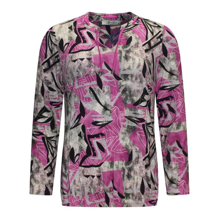 Blouson Rene is een stijlvol en elegant kledingstuk met een verfijnd dessin in een chique kleurencombinatie van roze en grijs. De ronde hals is afgewerkt met een subtiel koordje, wat zorgt voor een vrouwelijke en verfijnde touch. De lange mouwen maken deze blouson ideaal voor het najaar, terwijl de soepele stof en het elastische koordje zorgt voor draagcomfort gedurende de hele dag. Perfect te combineren met een grijze of zwarte pantalon voor een verzorgde en tijdloze look.