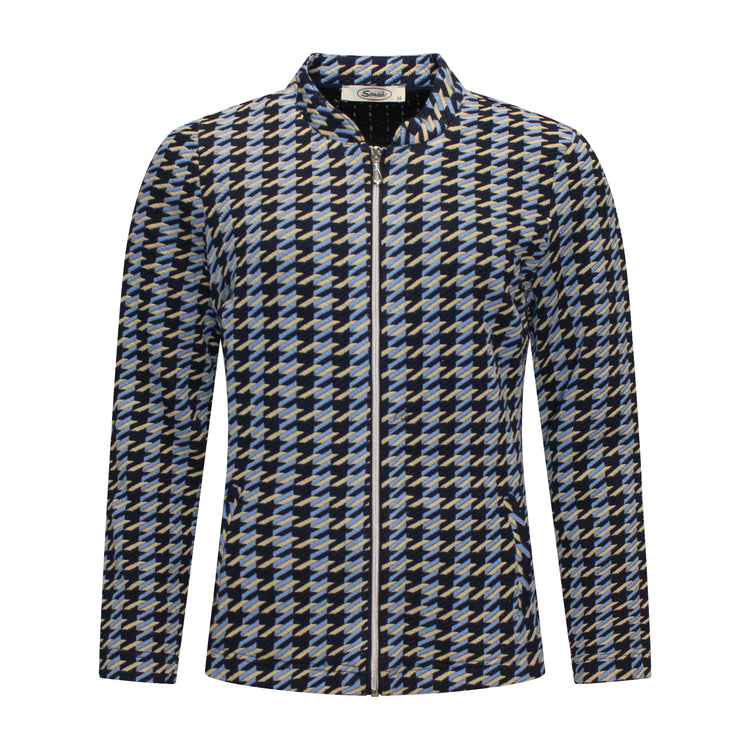 Sensia Vestjasje Romy in klassiek marineblauw met stijlvol grafisch patroon. Voorzien van lange mouwen, een praktische ritssluiting en handige steekzakken aan de zijkanten. Het opstaande kraagje zorgt voor extra warmte en een elegante uitstraling. Ideaal voor frisse najaarsdagen en eenvoudig te combineren met zowel casual als nette outfits.