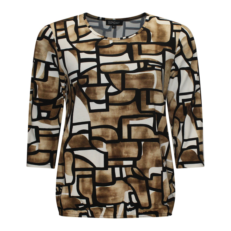 Sunday Blouson Aafke is een elegante blouse met een elastische boord aan de onderzijde het heeft een warme bruine print op een beige ondergrond. De driekwart mouwen en ronde hals zorgen voor een comfortabele pasvorm, terwijl de soepele stof een mooie valling heeft. Perfect te dragen tijdens frisse najaarsdagen, zowel casual met jeans als gekleed met een rok of pantalon.